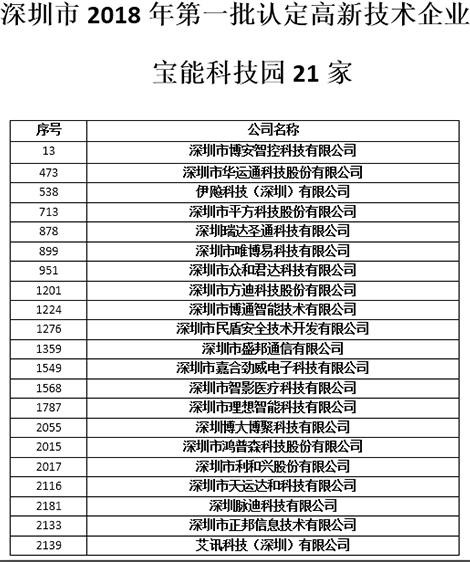 2018 年 10 月 16 日,深圳市科技创新委员会发布 2018 年深圳市第一批高新技术企业名单,宝能科技园有 21 家企业入选。