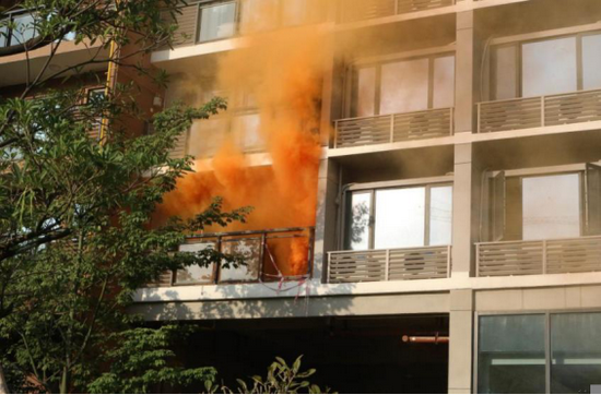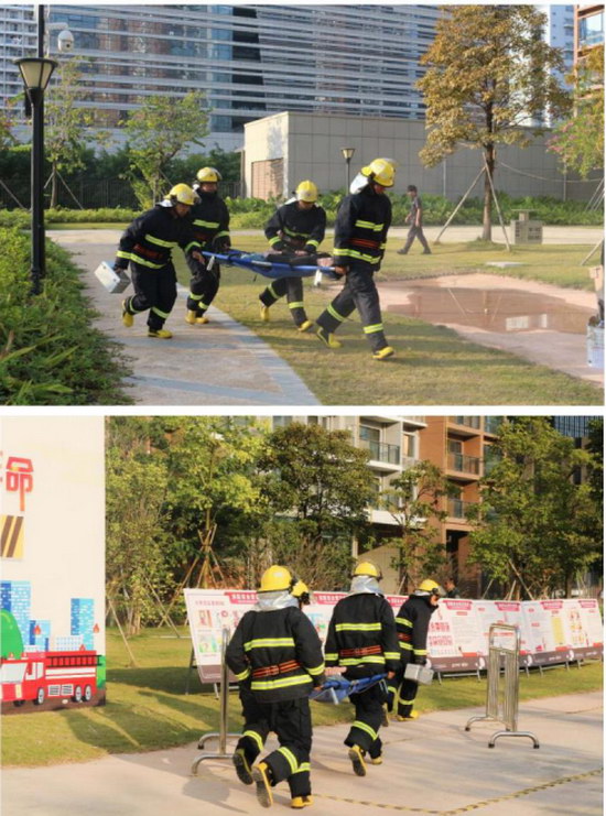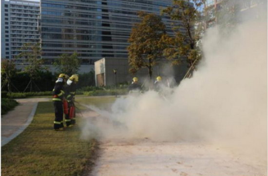 宝能科技园安全小组使用安全烟雾弹模拟失火效果,并模拟进行安全救援