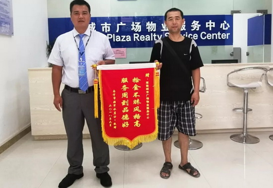2018年7月2日,南宁城市广场服务中心收到9栋122商铺陈先生送来的一面写着“拾金不昧风格高,服务周到品德好”的锦旗,对安管员杨天勇拾金不昧的高尚道德情操表示赞扬。