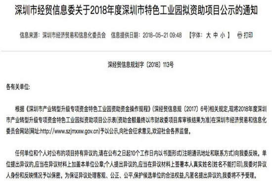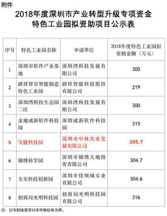 近日,宝能科技园从深圳 200 余家参与申报的特色产业园区中脱颖而出,获得由深圳市经济贸易和信息化委员会评审的“2018 年度深圳市特色工业园”荣誉称号。本次共有 8 家科技园区获评,国有园区及民营园区各四家,宝能科技园是民营企业中获得资助资金最高的园区,并在“深圳市发展和改革委员会”官网提名为《深圳市 2018 年重大项目计划》,获资助资金 305.7 万元。