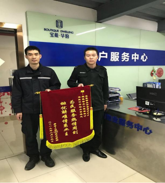 近日,一面写着“为民服务热情周到,排忧解难情系业主”的锦旗送到了吉祥服务集团深圳宝能华府物业服务中心。这是怎么回事呢?原来,2 月 12 日上午,深圳宝能华府物业服务中心安管部带班班长胡绿林在巡查至 A 栋 32 楼时,听到天台方向传来呼救声,他迅速呼叫附近同事请求支援并同时快速爬上天台。到天台发现原来是 A 栋 1302 的业主李丽女士,简单沟通后得知,她上天台晾晒衣物时脚下踩空卡进管道保护栏,没带手机,只能大声呼救。