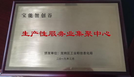 2019 年 3 月,宝能智创谷荣获由龙岗区工业和信息化局颁发的龙岗区“生产性服务业集聚中心”资质,领先一步成为龙岗区首批获得该资质的园区。生产性服务业是指服务于农业、工业、贸易等各类服务业,是实现制造业和服务业衔接的重要行业。2018 年,龙岗区工业和信息化局颁布了“生产性服务业集聚中心”的建设和租金扶持政策,促进生产性服务业的高质量发展和产业集聚。宝能智创谷作为龙岗平湖的标杆产业园,坚持以“服务”为核心, 依靠集团的强大实力及自身的优异素质为企业发展提供动力,顺应产业发展趋势和政府政策导向,大力集聚生产性服务业,为龙岗区产业发展贡献力量。在集团领导的高度重视和支持下,宝能智创谷的品牌实力、软硬件条件、产业布局等获得了龙岗区政府的全方位认可,并成功拿下了龙岗区首批“生产性服务业集聚中心”资质。