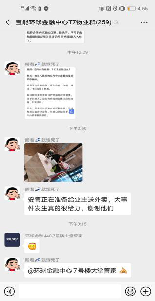 考虑到社区还有一些年纪较大的独居老人,为了照顾他们,物业工作人员帮他们把外卖送上门,并时刻关切询问他们的身体状况,这些都让业户们很受感动。