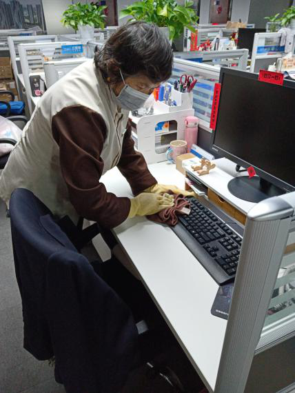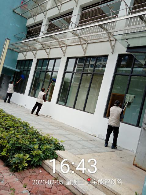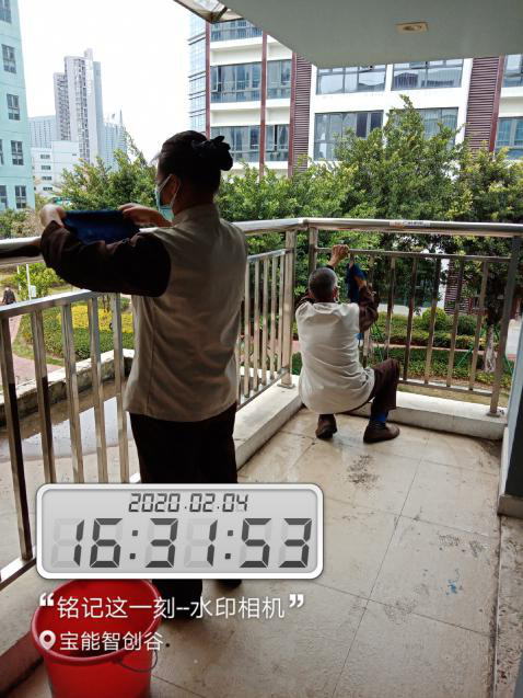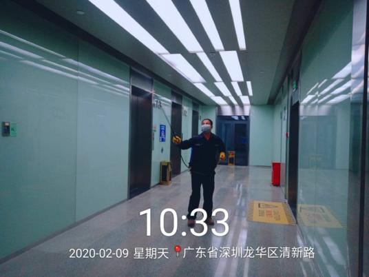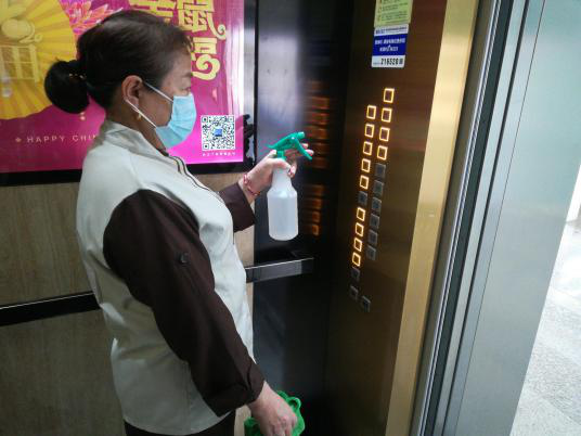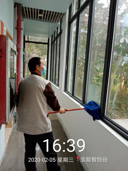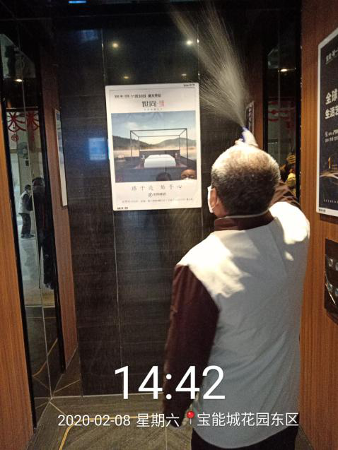 深圳宝能科技园保洁领班谢春燕和毕长合身先士卒,带领员工细细检查并严格消毒每一个角落,确保完成园区50部电梯和15个大堂等近80万平方米的消毒工作。