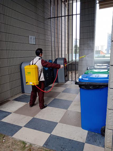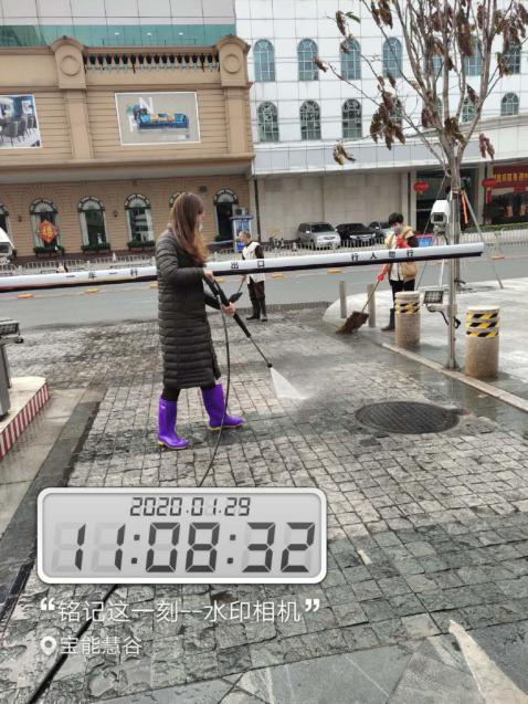我们在这里,请您放心。我们每天对住宅小区、产业园区、商场的地面、墙面和楼梯间都全面消毒,让您可以放心进出。