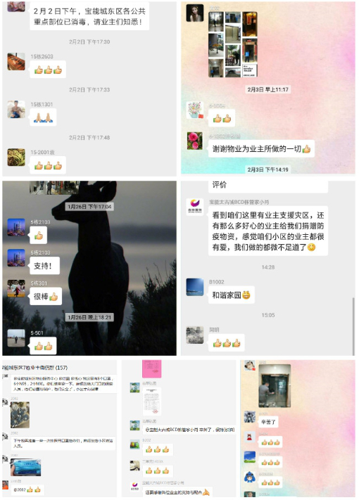 业主群里的点赞。“2月2日下午,东区15栋电梯已消毒完毕”、“2月1日上午,东区10栋单元门大厅已消毒完毕”、“西区5栋部分业主代购物资已到位,物业工作人员将送货上门”,每条信息的后面,都跟着一大批业主的“大拇指”点赞,这是宝能世纪城、宝能太古城业主群里经常出现的画面。疫情防控期间,吉祥服务管家每天要通过微信群里向业主实时报告小区防疫工作动态,这既是方便业主对物业管理工作的监督,更多的是给业主一份安心与放心,而业主的点赞则是对他们工作最大的认可。