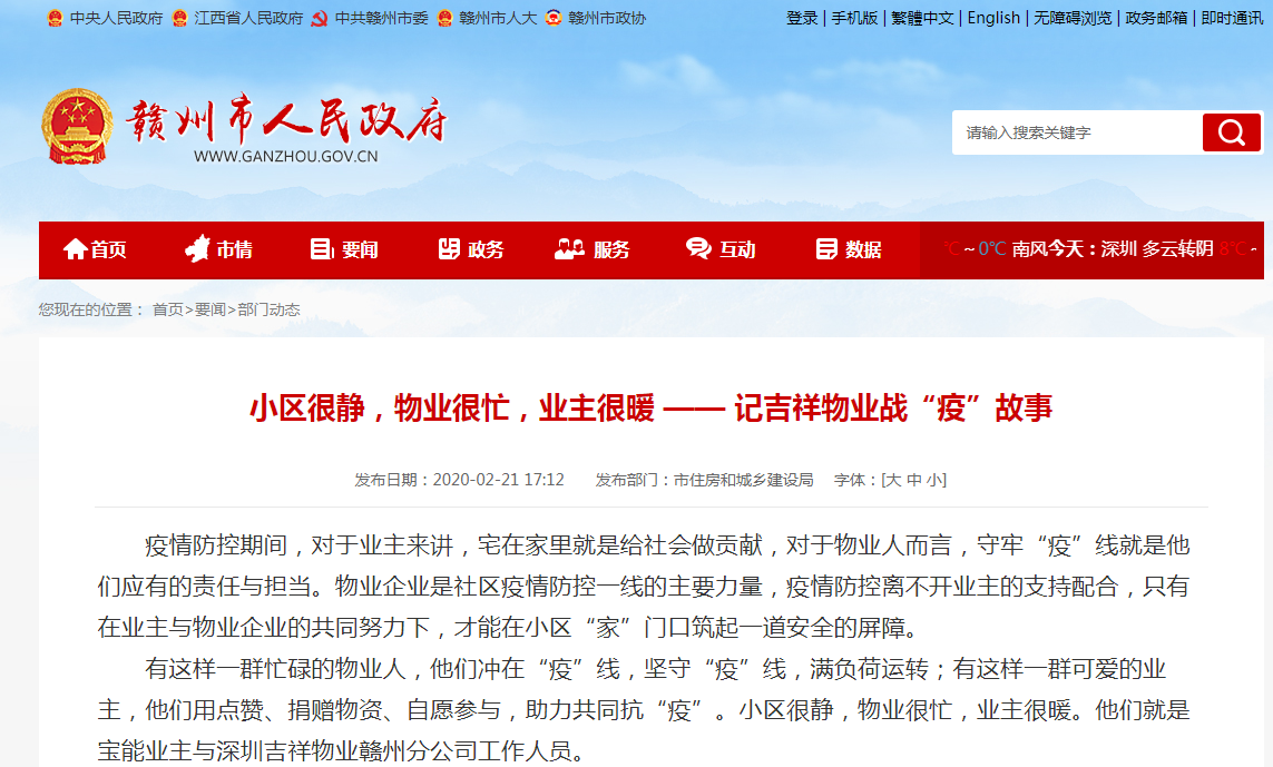 有这样一群忙碌的物业人,他们冲在“疫”线,坚守“疫”线,满负荷运转;有这样一群可爱的业主,他们用点赞、捐赠物资、自愿参与,助力共同抗“疫”。小区很静,物业很忙,业主很暖。他们就是宝能业主与吉祥服务集团赣州分公司的工作人员。