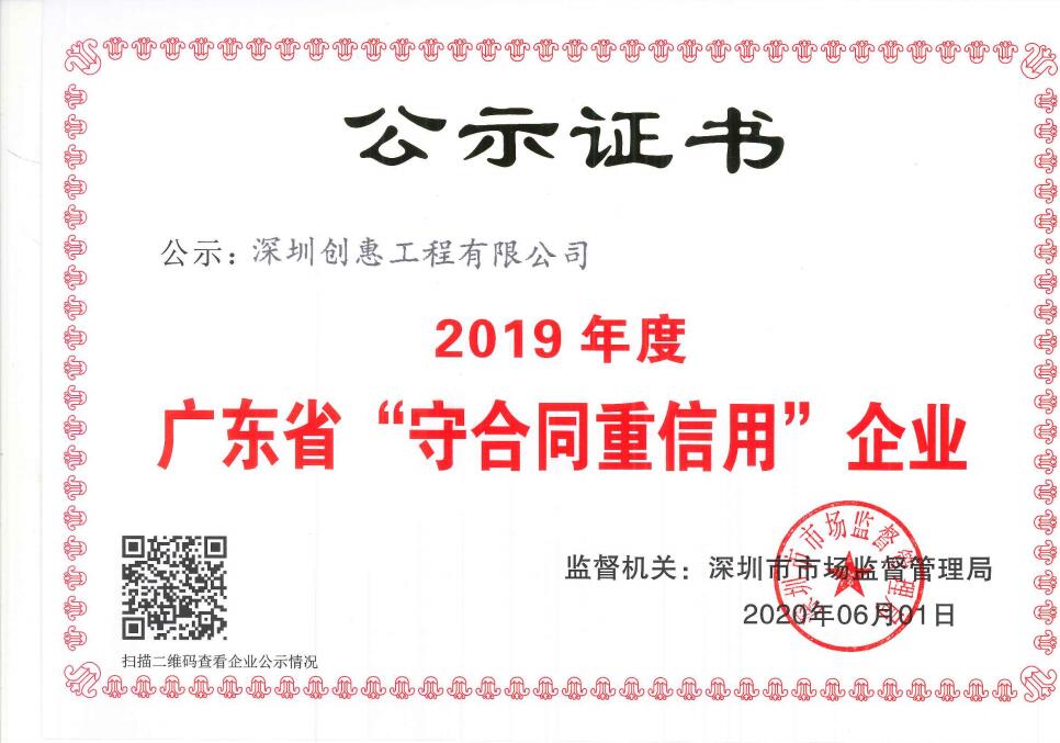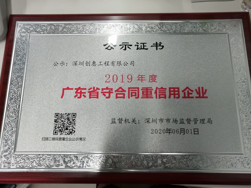 近日,由深圳市市场监督管理局公示,权威认定创惠工程公司为2019年度广东省“守合同重信用”企业,意味着社会、政府、市场客户等多方对创惠工程公司诚信经营的充分肯定。