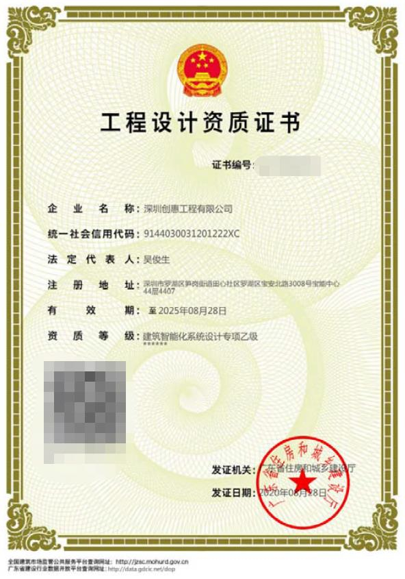 2020年9月,由深圳市住房和建设局公示,授予创惠工程公司“智能化系统设计专项乙级”资质。至此,创惠工程公司成功获取了智能化工程施工与设计的双重资质,实现了公司在施工和设计方面齐头并进。