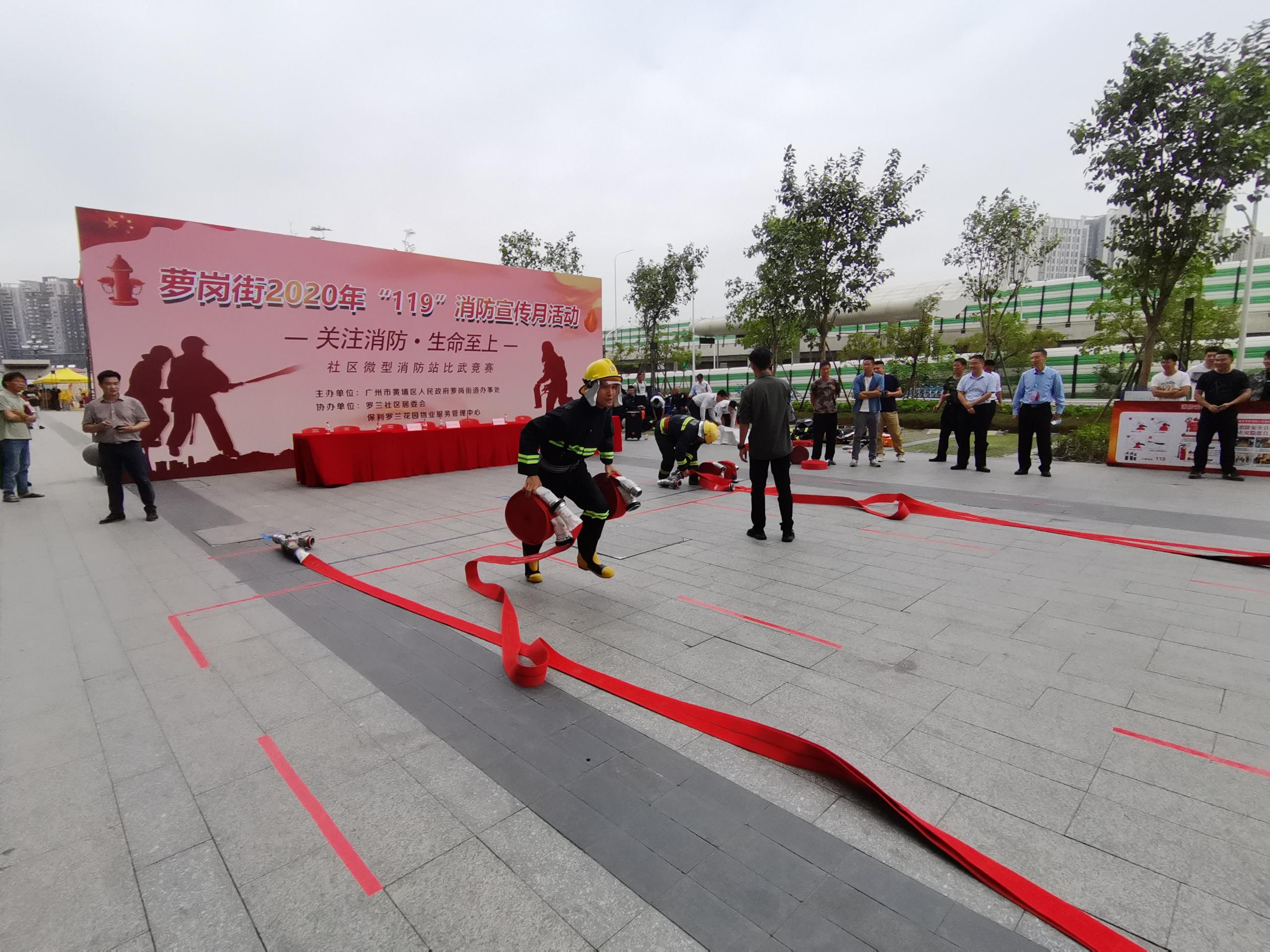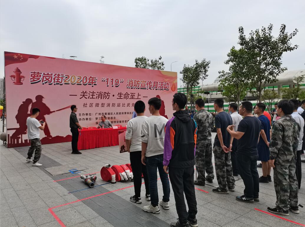 为有效预防火灾事故的发生,增强消防安全意识,加强萝岗街道微型消防站队伍建设,检查消防队伍的训练成果,11月17日,广州市黄埔区萝岗街道香雪社区邀请广州宝能文化广场参加萝岗街道组织的“119”消防宣传月活动——社区微型消防站比武竞赛。来自街道7支社区微型消防站代表队、近30名队员同场竞技。