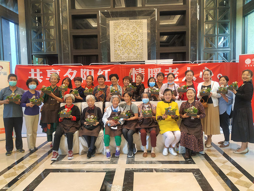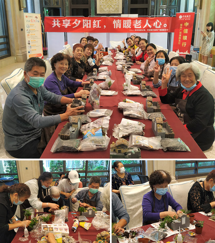 重阳节当天,深圳宝能公馆物业服务中心策划了微景观盆栽DIY活动,社区长者应邀而来,在现场助手的帮助下兴致勃勃地摆弄花草,个个喜笑颜开。