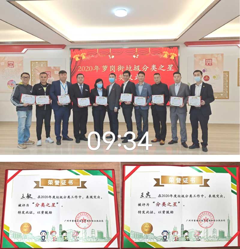 2月初,吉祥服务集团广州宝能文化广场项目再次获得环保类奖项。项目经理王宾及环境主管王敏在年度2020年度垃圾分类工作中表现突出,荣获广州市黄埔区城市管理和综合执法局颁发的“分类之星”荣誉称号。