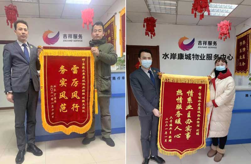 近日,写有“雷厉风行、务实风范”、“情系业主办实事、热情服务暖人心”字样的两面锦旗送到了吉祥服务集团沈阳水岸康城物业服务中心,项目负责人刘醒代表团队从两位业主手中接过了锦旗。