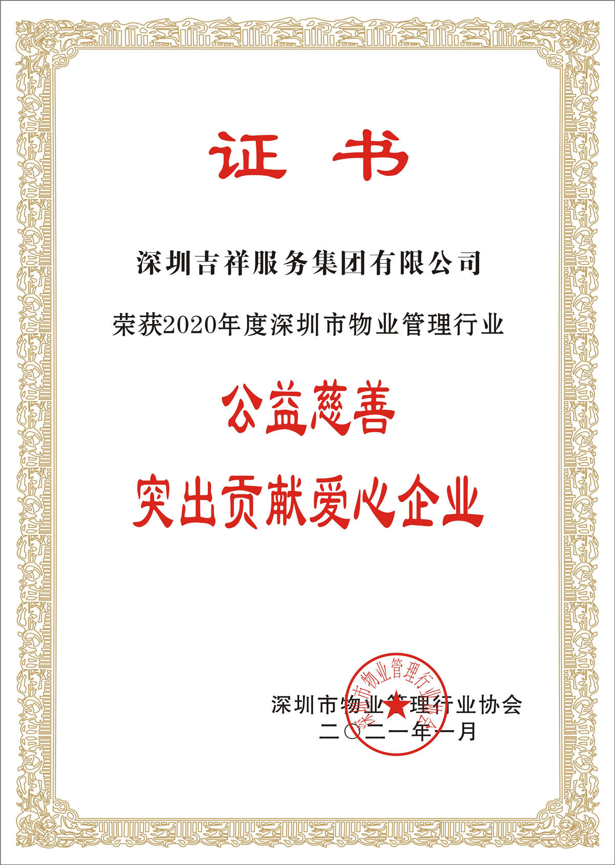 日前,深圳市物业管理行业协会对2020年度在扶贫、公益慈善方面表现突出的物业服务企业进行了表彰,吉祥服务集团被授予“公益慈善突出贡献爱心企业”称号。